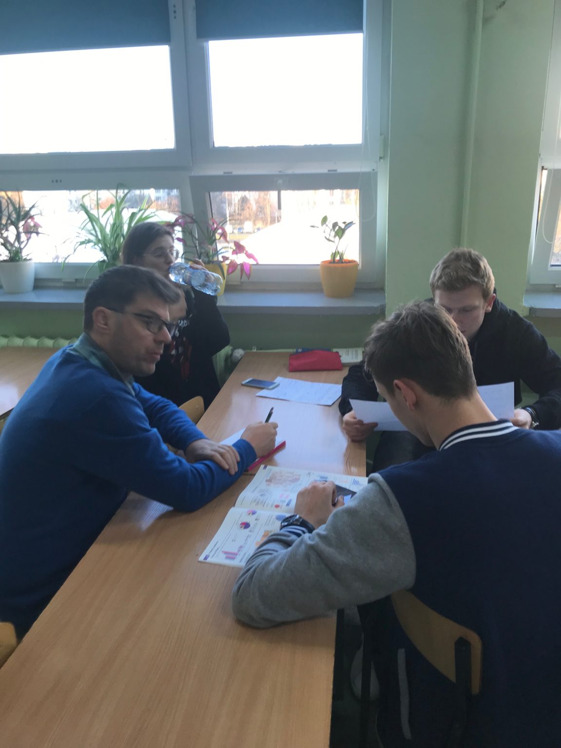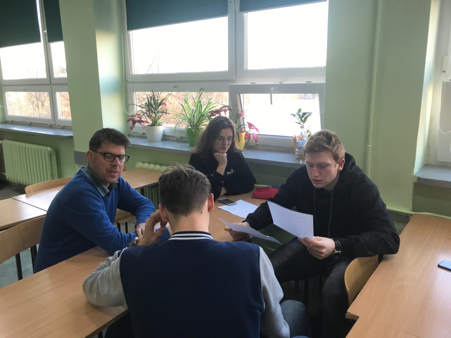 Phil Jones – dziennikarz, native  speaker dwukrotnie spotkał się z grupą młodzieży naszego Liceum przygotowująca się do wyjazdu do Parlamentu Europejskiego w Strasburgu.w ramach programu European Day (wygrana w konkursie Euroscola). Uczniowie otrzymali wcześniej zagadnienia dotyczące wyzwań i problemów, przed którymi stoi nie tylko UE ale cały świat i musieli przygotować się do dyskusji,