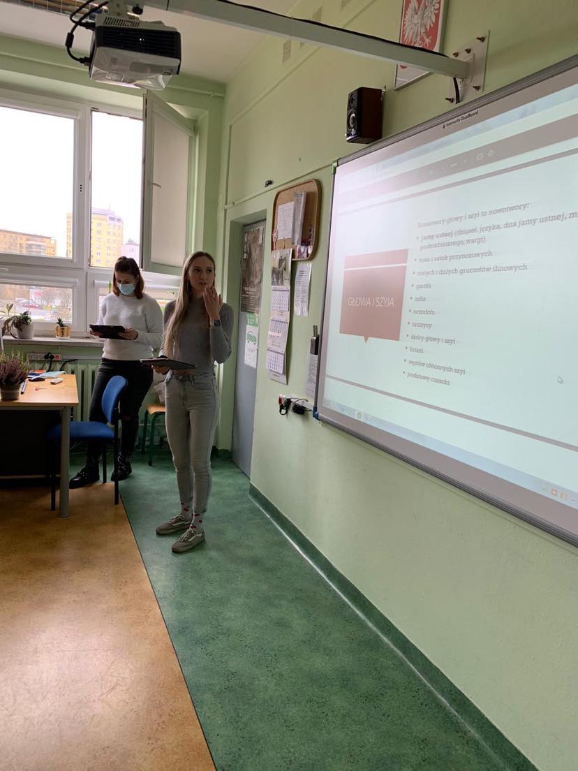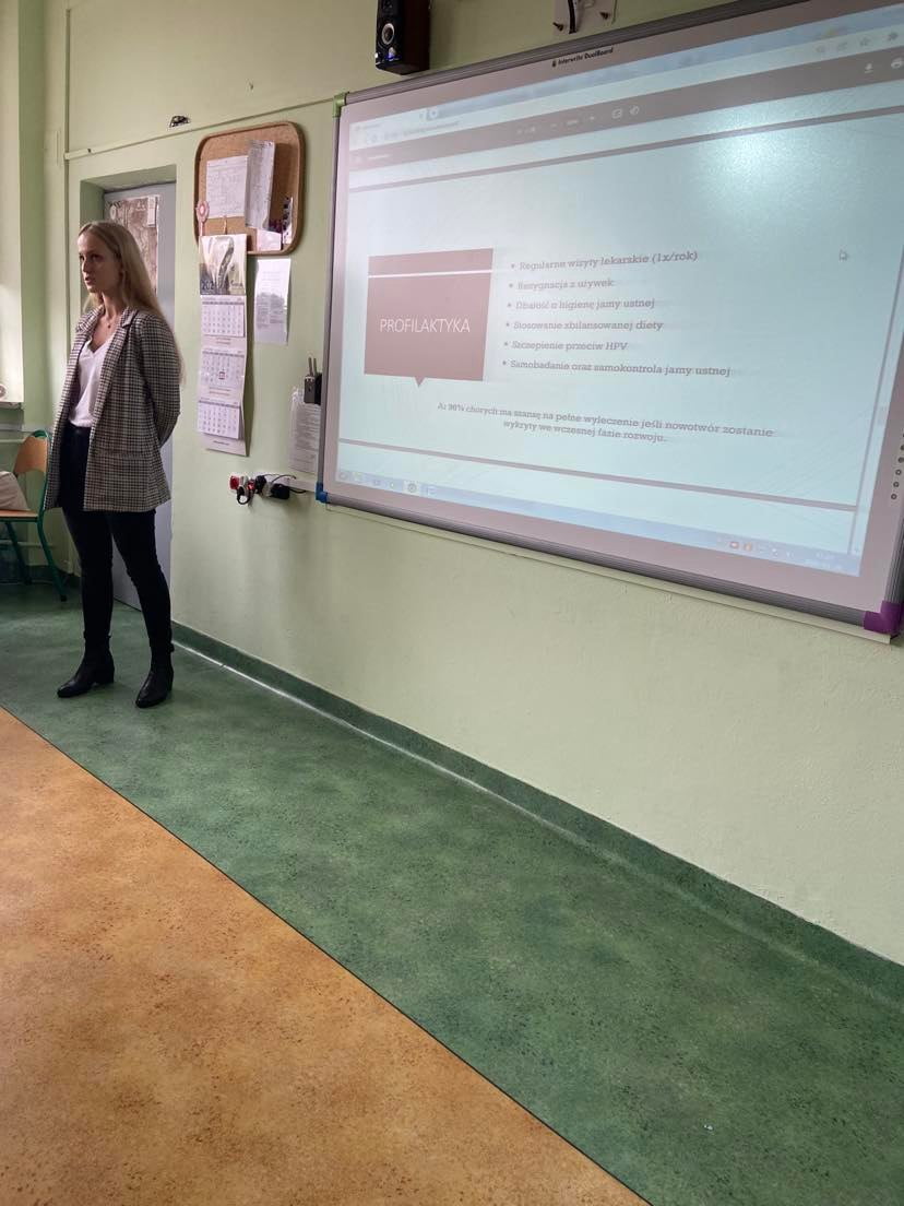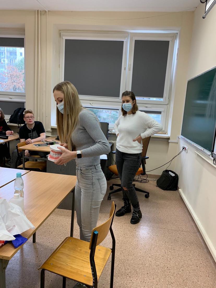 Studentki stomatologii Warszawskiego Uniwersytetu Medycznego, w tym absolwentka naszej szkoły Dominika Domanowska, przeprowadziły zajęcia w klasach 3Bg oraz 3Bp w ramach akcji profilaktycznej Polskiego Towarzystwa Studentów Stomatologii. Tematyka zajęć dotyczyła profilaktyki nowotworów jamy ustnej, wiedzy o domowej diagnostyce nowotworów jamy ustnej, ich rodzajach, prawidłowym szczotkowaniu zębów, szczepieniach oraz promocja Wydziału Lekarskiego WUM.