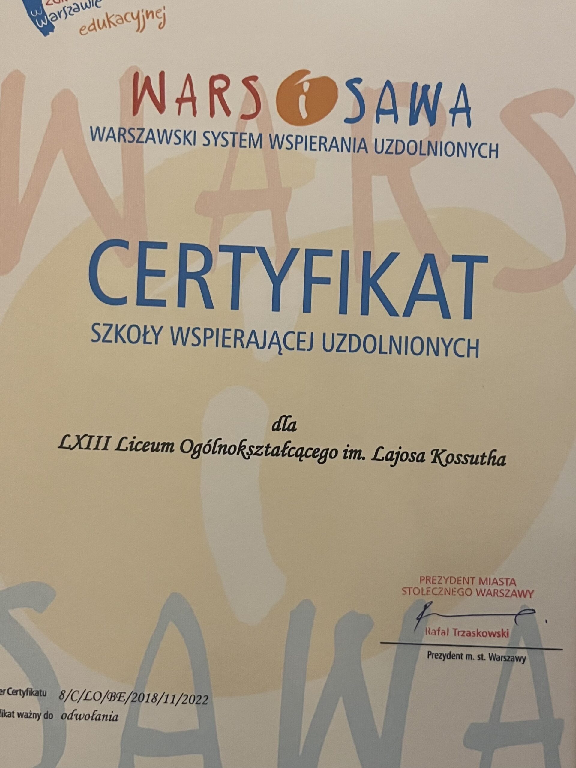 23 września 2022 roku w Centrum Nauki Kopernik otrzymaliśmy bezterminowy Certyfikat WARS i SAWA potwierdzający, że uzyskaliśmy pożądany standard opieki nad uczniami uzdolnionymi.