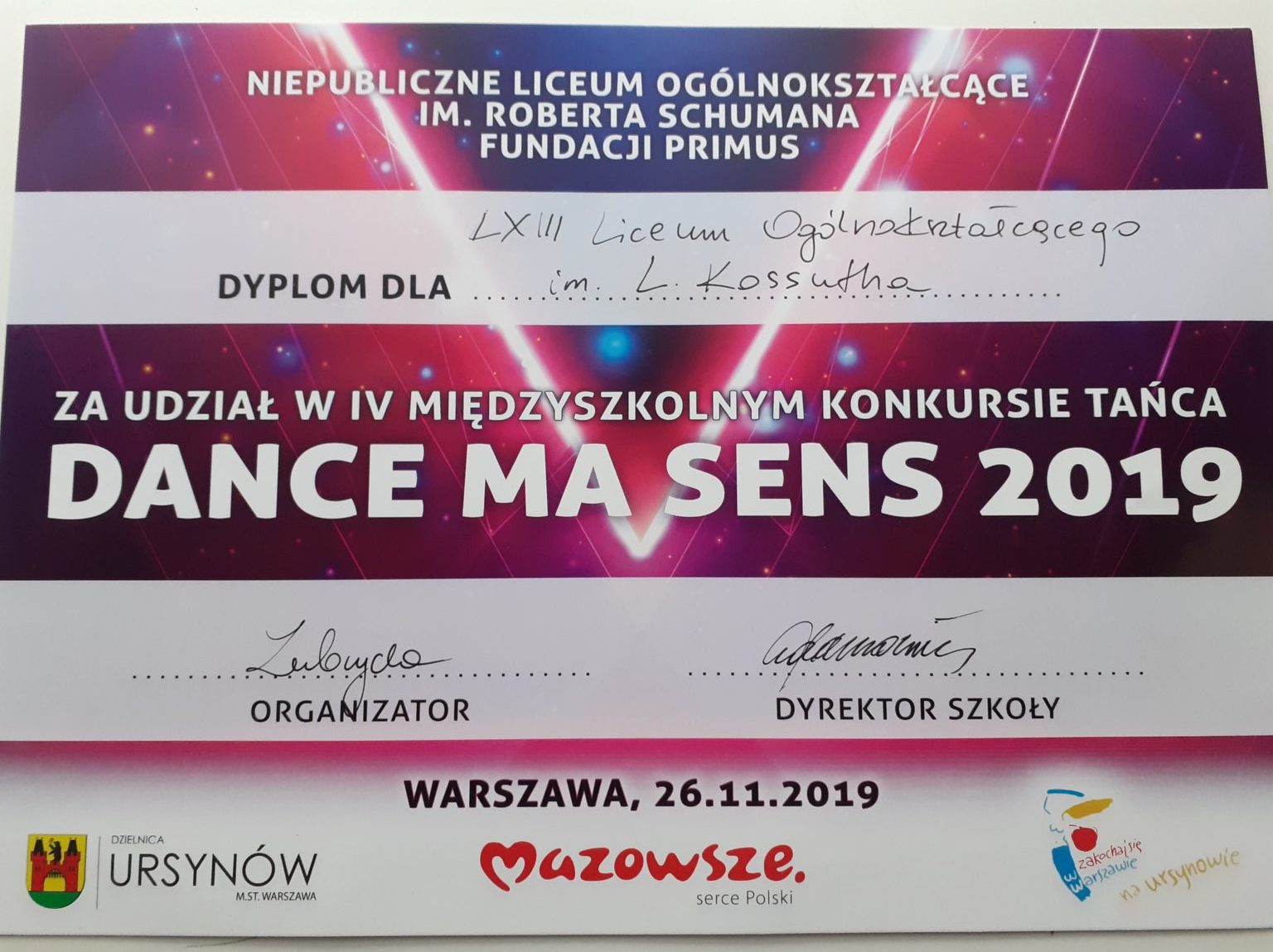 26.11.2019 roku nasza uczennica klasy 1bp Kinga Adamczyk reprezentowała LXIII LO w IV międzyszkolnym konkursie tańca.Po raz pierwszy, nasza szkoła brała udział w takim wydarzeniu , rywalizacja była bardzo duża i poziom umiejętności tanecznych zawodników był niesamowicie wysoki.Konkurs zorganizowany został przez Niepubliczne liceum im.Roberta Schumana pod patronatem Dzielnicy Ursynów oraz Mazowsza .Gratulujemy Kindze za przepiękny występ i życzymy dalszych sukcesów.