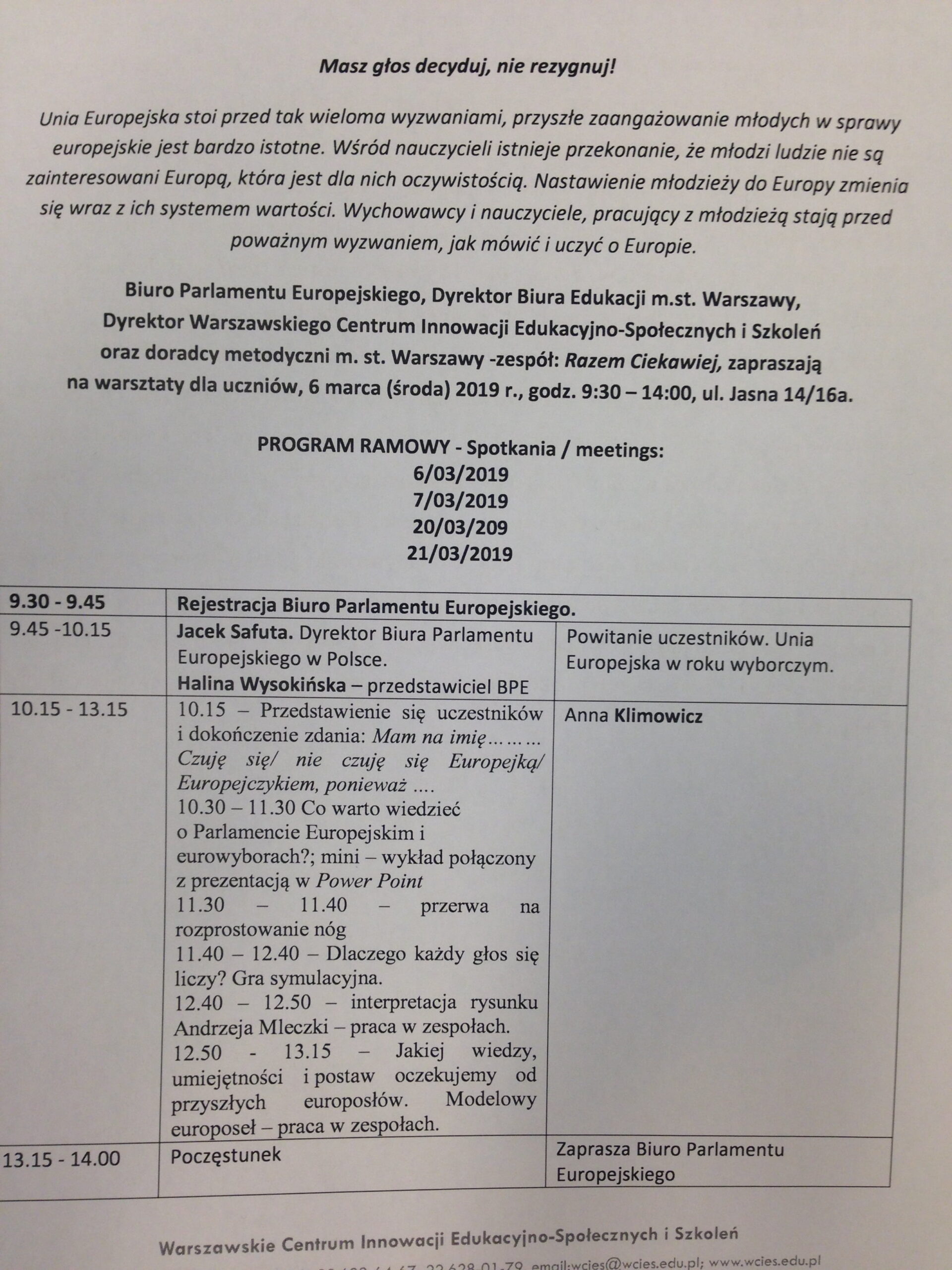 20 marca 2019 grupa uczniow z klasy 2a i 2c – Młodzi Ambasadorzy Parlamentu Europejskiego wzięli udział w kolejnym warsztacie poświęconym aktywności obywatelskiej w kontekście zbliżających sie wyborów europejskich. Było to spotkanie zorganizowane przez WCIES i Biuro Edukacji Miasta Stołecznego Warszawy. Spotkanie rozpoczął wykład Pani Angeliki Gieras – wykładowcy Wydziału Europeistyki UW i pracownika Punktu Informacji PE. Następnie odbyły sie zajęcia symulujące wybory. Młodzież mogła ocenić, jaki jest wpływ obywateli na sytuację w państwie demokratycznym