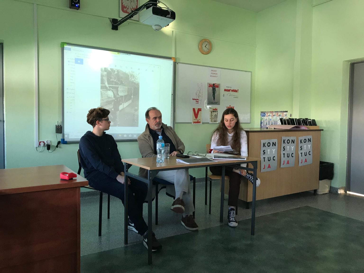Uczniowie klasy 1cp kontynuując działania związane z projektem „Podróże Wolności ” spotkali się z panem Leszkiem Wdowińskim – fotoreporterem obecnym w Stoczni Gdańskiej podczas strajków w sierpniu 1980, później współtworzącym ”Tygodnik Solidarność” oraz dokumentującym polska rzeczywistość przełomu lat osiemdziesiątych i dziewięćdziesiątych.