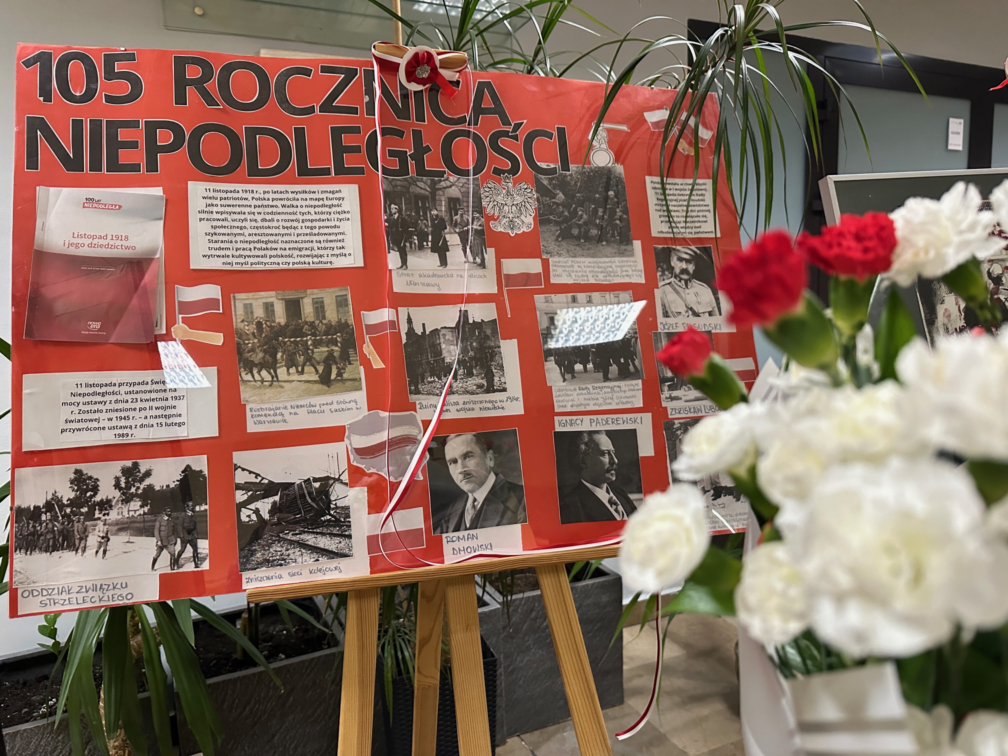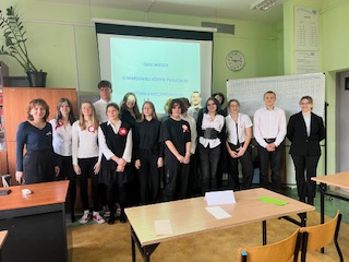 Tak się złożyło w tym roku, że obchodzimy Święto Niepodległości, a konkretnie 105 rocznicę, w kilku odsłonach. Pierwsza nastąpiła 10 listopada, co oznaczało przystąpienie uczniów do quizu o marszałku Józefie Piłsudskim, Wirtualnego Festiwalu „Iskry Niepodległej”, ogólnopolskiej akcji „Szkoła do hymnu”. Uczniowie przyszli dziś do szkoły ubrani galowo, z przypiętymi kotylionami, co pozwoliło przeprowadzić konkurs na najbardziej odświętnie przygotowaną klasę – mieliśmy „Dzień z kotylionem”. W tej kategorii wygrały klasy IIIB i IE, które w 75% zadbały o strój galowy.