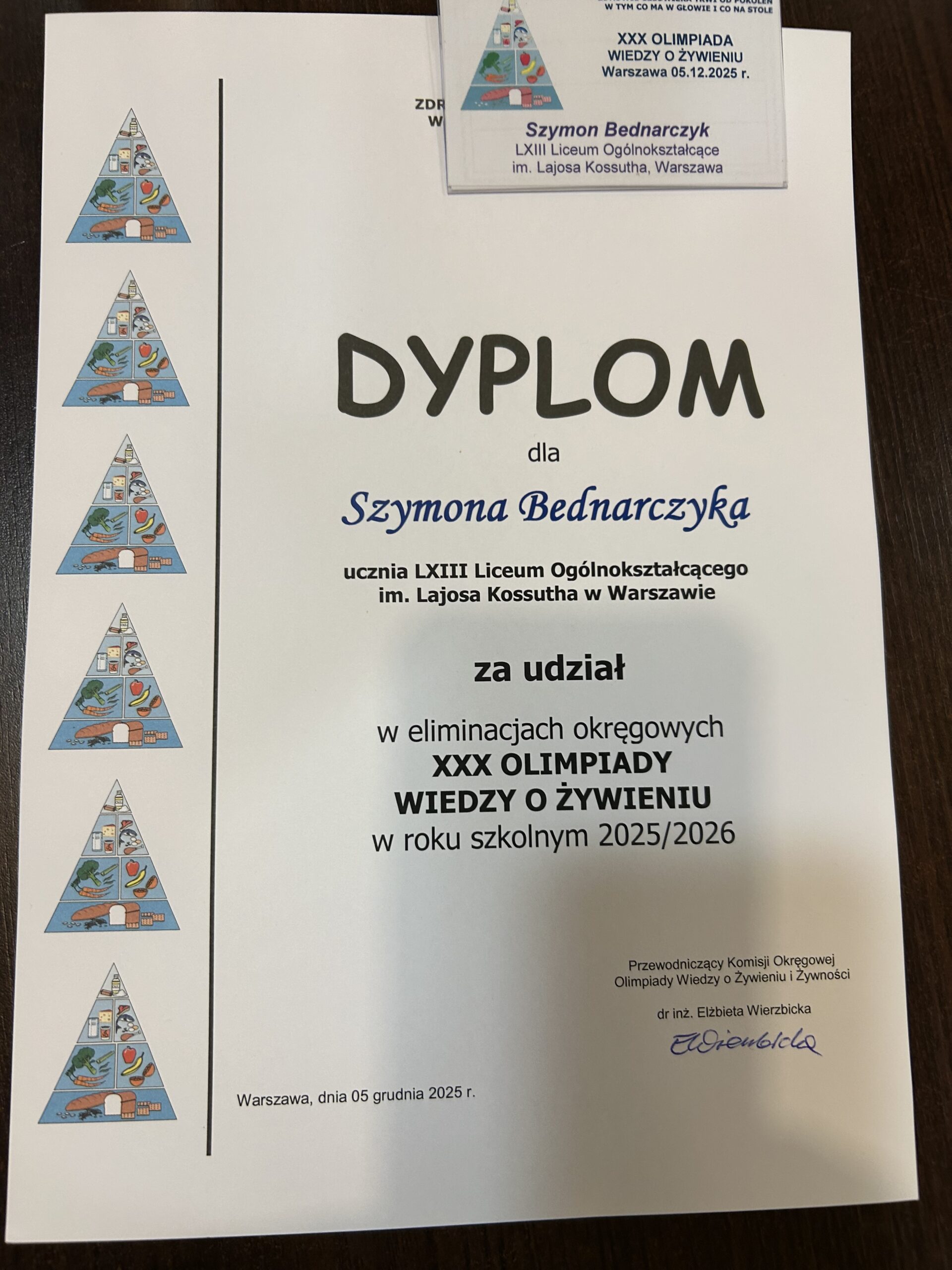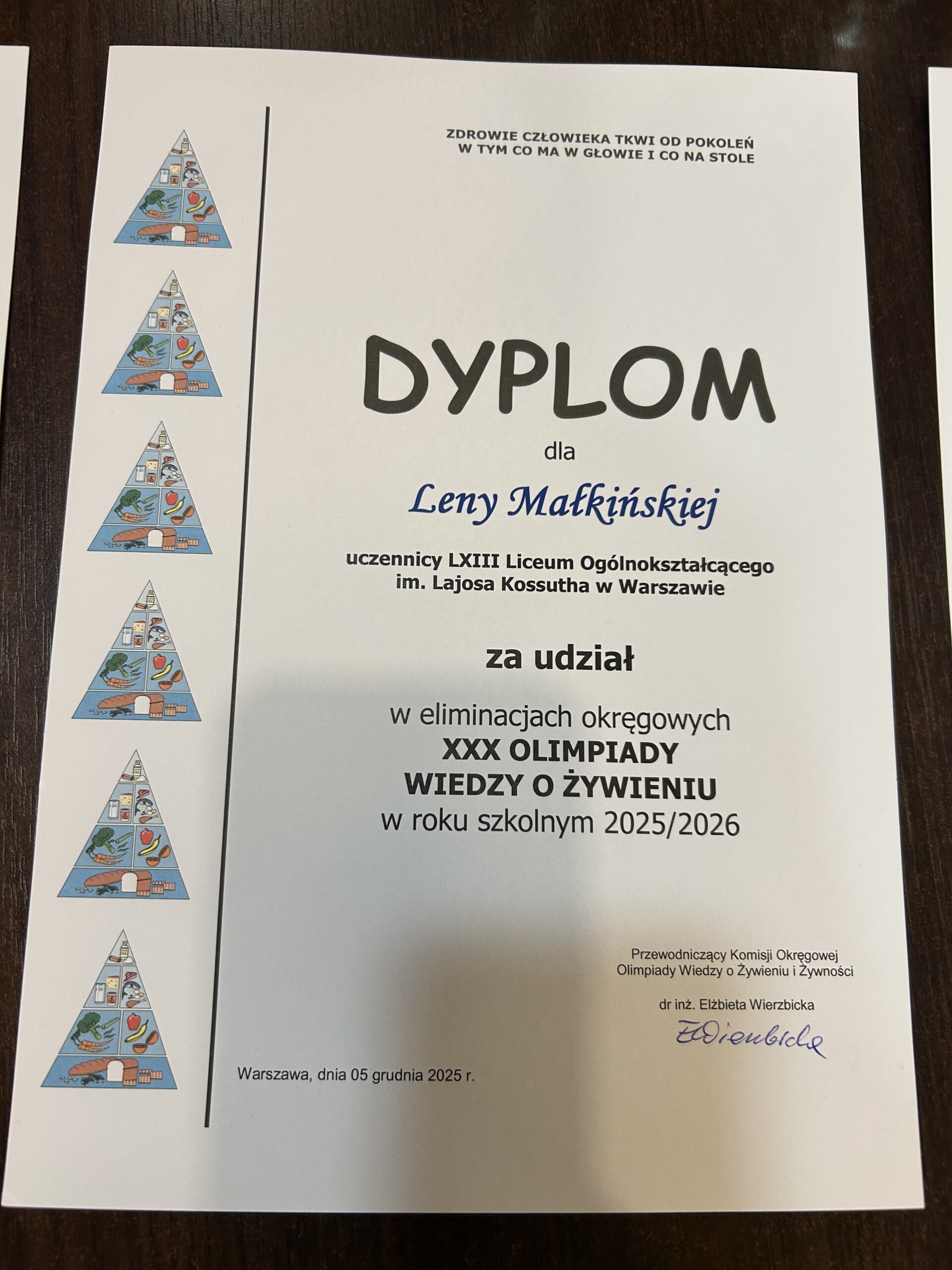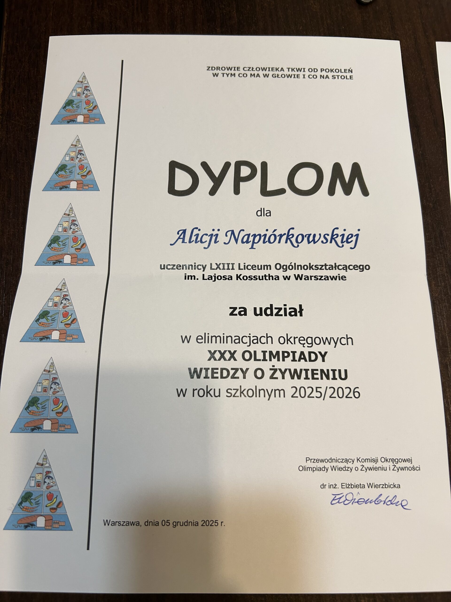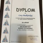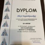 W piątek, 5 grudnia 2025 roku, w Zespole Szkół Gastronomicznych im. prof. Eugeniusza Pijanowskiego w Warszawie odbył się drugi etap XXX Olimpiady Wiedzy o Żywieniu. Spośród 500 uczestników z województwa mazowieckiego do etapu okręgowego zakwalifikowało się 77 uczniów, w tym troje reprezentantów naszego liceum: Lena Małkińska (kl. 2b), Szymon Bednarczyk (kl. 2b) oraz Alicja Napiórkowska (kl. 3b).