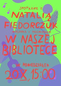 ,,Serdecznie zapraszamy na spotkanie autorskie z p.Natalią Fiedorczuk, pisarką, piosenkarką, autorką piosenek, wokalistką zespołu Nathalie and the Loners. Laureatką nagrody ,,Paszport Polityki”, które odbędzie się: